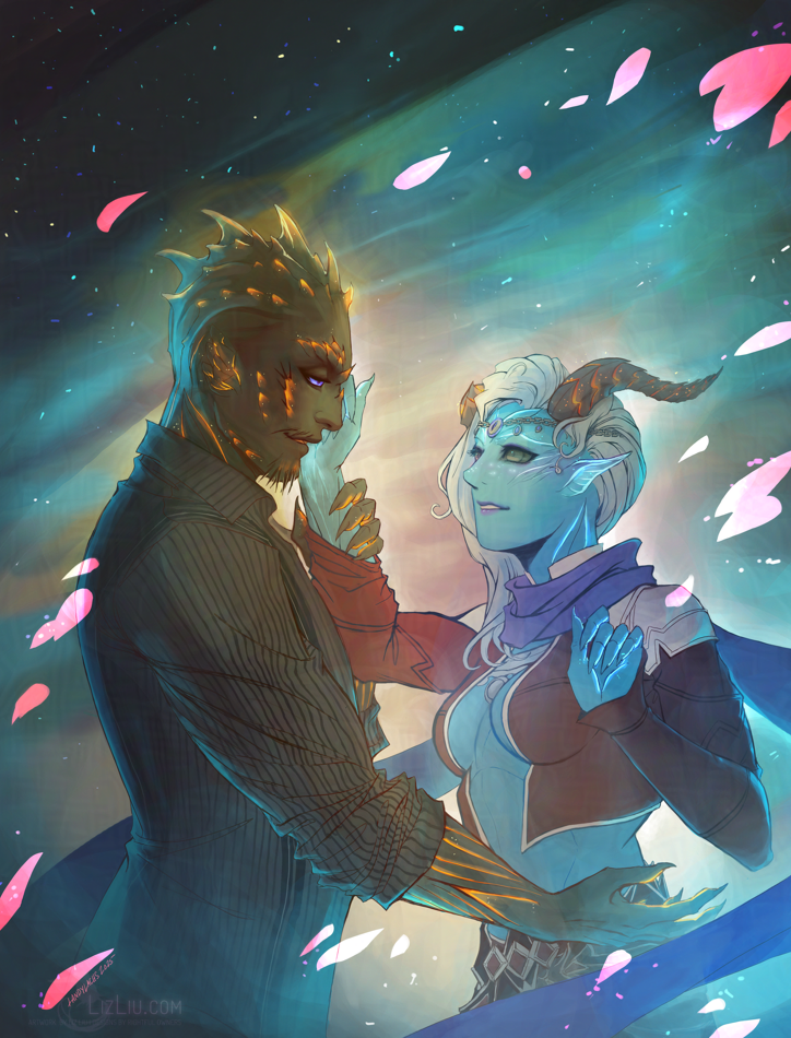 Canach loosely embraces Akoni as she places her hand against the side of his face. Cherry blossom petals gust gently around them.