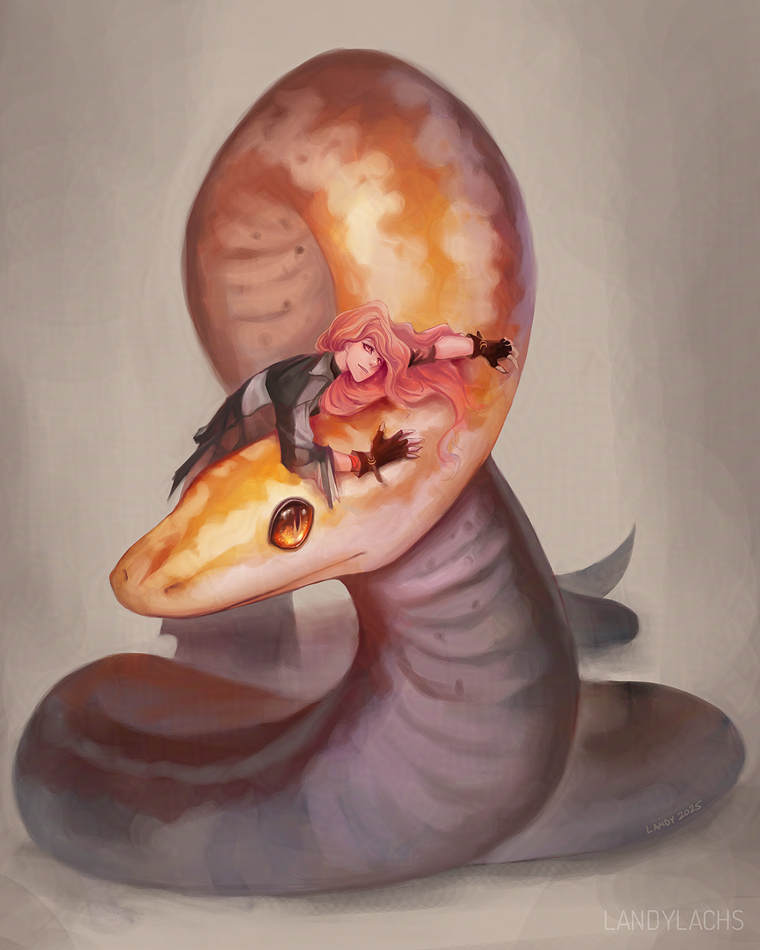 Happy Year of the Snake! I’ve had a sketch of Aurelle with her pet snake or familiar I did a while ago, and today seemed an opportune time to try and add to it.