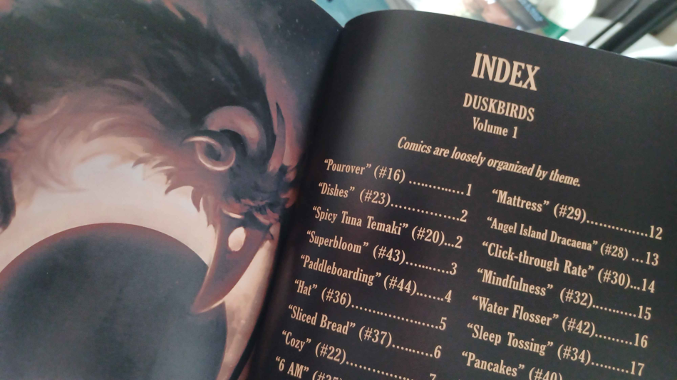 I wanted to put together an index page for both zine volumes. I mainly thought it would be neat to see all the comics stacked up at the front there. I didn’t include every comic due to time – many of the earliest comics are quite rough, and I wanted to only include the comics I felt were presentable as-is. Or, that I could touch-up and make presentable within the these time constraints. When i began the zine’s layout, there were 42 Duskbirds Comics posted – the last one being #42, “Pancakes,” all the way back from last year! (I hadn’t posted one since then because I spent last year drawing The Harbinger’s Path comic).