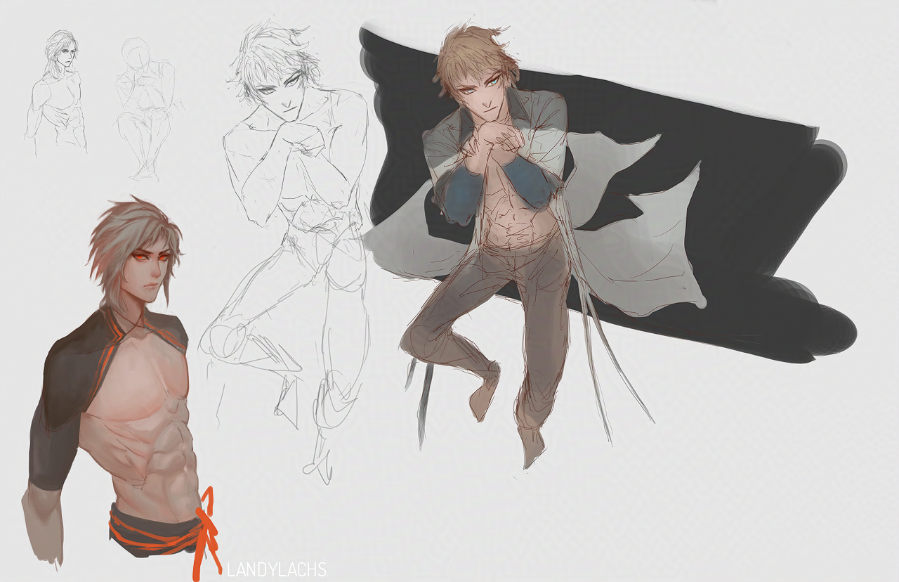A few recent sketches of Corveil and Kurt I just wanted to post for myself. :) With Corveil, I was trying out some hairstyle options for him. I started with a longer hairstyle (which you can see in the top-left initial sketch), because while shorter hair probably suits his character better, I tend to lengthen his hair when I draw him purely because longer hair tends to be more fun for me to draw, haha. I was also doodling one of his outfits here, that I’d been fiddling with in other sketches. I think I semi-recently added the orange ribbon around his waist, at the time of sketching this. With Kurt, I think I just wanted to draw the tails of his jacket (this sketchpage is from the end of December, a little while ago now).